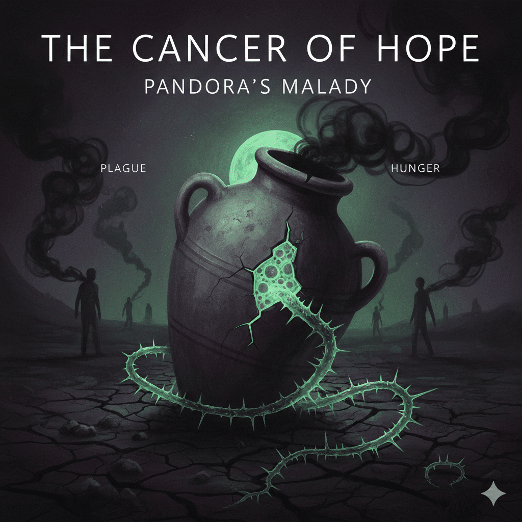 While I can’t blame Pandora for caving into her human desires—after all, she is human—I understand that. Still, I believe the myth has a darker ending. I believe Hope did manage to escape, but it did not emerge as a savior; it escaped as a cancer. Imagine Pandora desperately wishing her actions were undone. She hoped for any solution to make what she had done better. By wishing for a cure, no matter the cost, she allowed Hope to mutate into a spiritual malignancy. She inadvertently gave Hope a piggyback ride out of the jar. Corruptly binding it to the very evils she had just released. Hope became a cancer that spreads across the globe. It is a pitiful emotion that keeps the terminal patient reaching for a tomorrow that will never come.